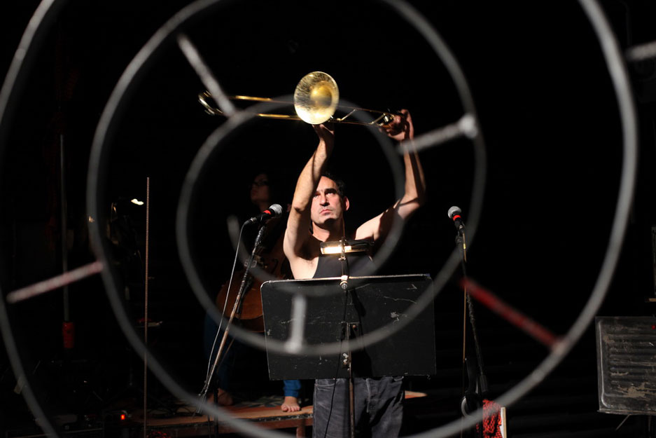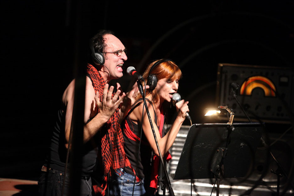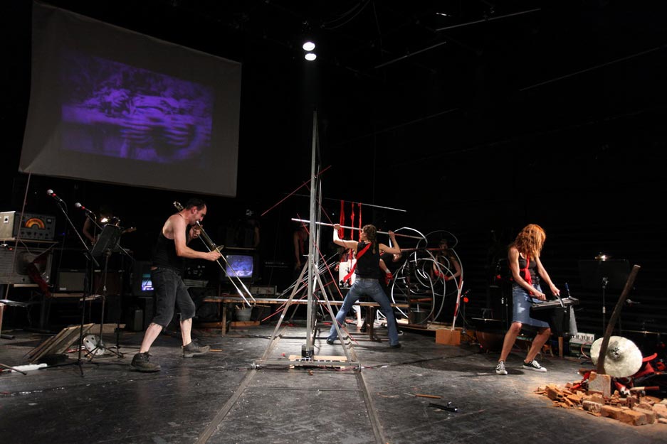 Anti Oedipus, a music spring machine, produces several regimes of separation and connection – diagrammatic (from the line of flight to apartheid wall and penetrated wall), schizophonic (persecution of external sound by the other sound in the headphones), territorial (diagonal occupations and decolonization of country and scene), transtextual (pseudo-translation of original text in the headphones by simultaneous live performing of another text), transvisual (editing of hybrid filmscape depicting world in war and world in solidarity), anachronical (deterritorializations of Anti Oedipus from occupied West Bank to the free territory of anarchy, traveling by bicycle from Graz to the short summer in Catalonia), metamobile (false movements within limiting spaces as the smooth spaces of freedom).