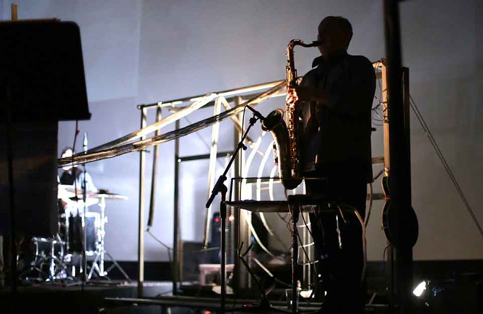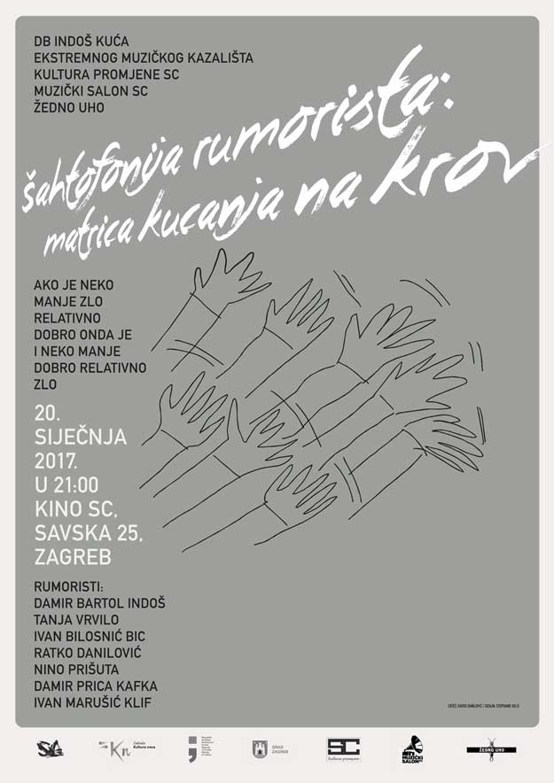 From a tool room of the former factory of hydraulic pumps, the spring music machines Schachtophones came up rolling down to a Russian stage of Kino SC, and creating concrete fusion of Russolo's Intonarumoris by performers DB Indoš and Tanja Vrvilo, noise rock - guitar, drums, bas, schachotphone installation by Ivan Bilosnić Bic, Ratko Danilović, Nino Prišuta (ex SexA), free jazz sax of Damir Prica Kafka Capri and video performance by Ivan Marušić Klif, under the surveillance of forensic mirrors.