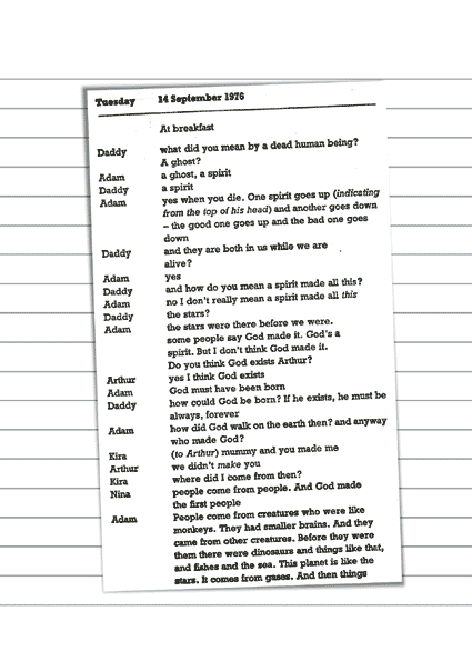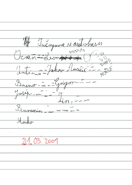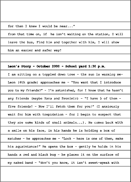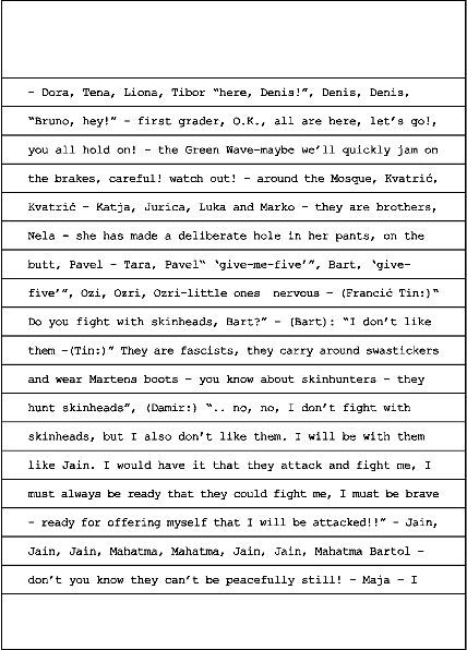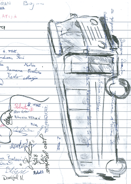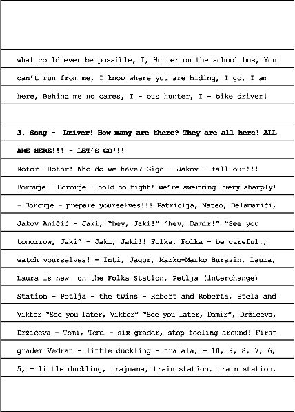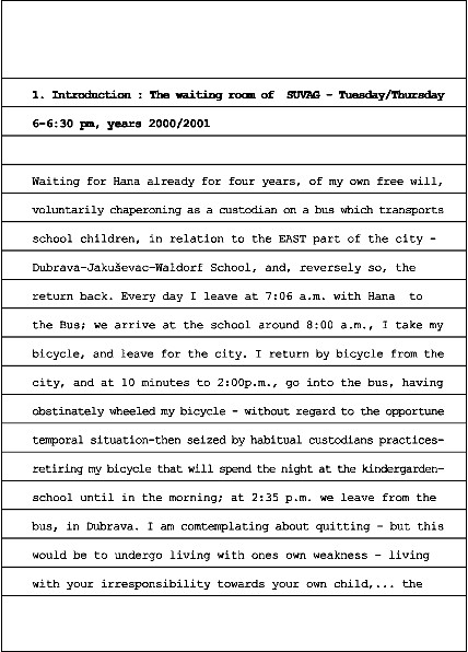 Multimedia performance (video animation N. Hewitt, music and sampling H. Hinteregger) is based on true events from the school bus, which has been driving children to the Waldorf school in the year 2000./2001. Two original stories about the pupils, elements from the educational process, as well as conversations with his own children recorded by the antipsychiatrist R.D. Laing are inserted into the bus ride. The two original stories, presented in a documentary way, point out the problems of loneliness and fear/consience of the pupils/children in relation to school/family. The educational process is represented by some typical examples from the classes of mathematics and foreign language. The included examples support the processes towards democratic education and the demilitarization of the school system. The conversations recorded by R.D. Laing reveal the viewpoints of children and parents towards military, violence, relations within a family and childhood. The aim is to re-sensibilize adults to topics such as education, democracy, sincerety and their interrelations.